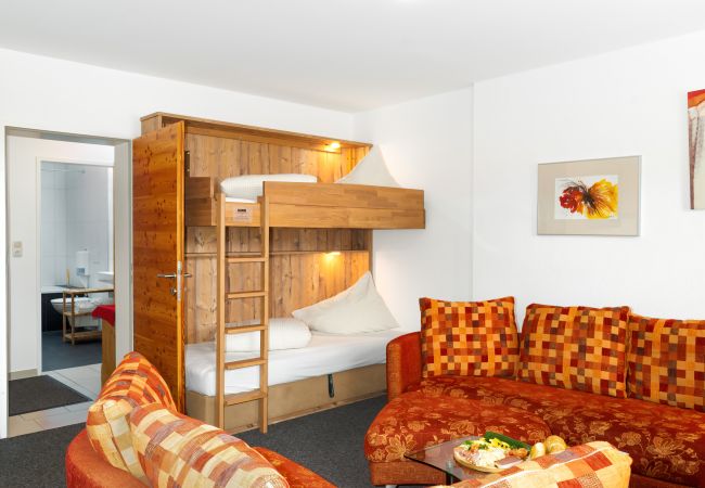 The Kreuzjoch 142 vacation apartment offers space for up to four people. The cozy bedroom with double bed ensures restful nights, while a bunk bed in the living area provides additional sleeping comfort. The spacious kitchen is ideal for socializing. The apartment does not have its own bathroom, but there are washing facilities, a shower and a WC in an adjoining communal area, which is shared with another apartment. However, each apartment is allocated its own area here. The balcony offers the perfect place to relax with a fantastic view of the Stubai Alps and the surrounding nature.