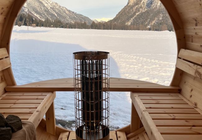 Für absolute Entspannung sorgt der Außenbereich mit Sauna und Whirlpool, die dazu einladen, nach einem aktiven Tag in den Bergen zu entspannen und die Ruhe der Umgebung zu genießen.